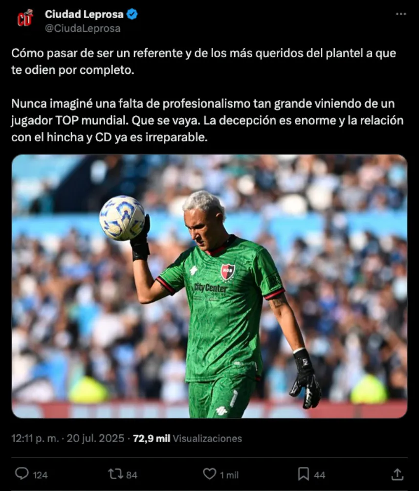 Los insultos y señalamientos no solo se dieron en las gradas de La Lepra, en redes sociales la conversación lleva días siendo tendencia en Argentina, donde tachan de poco profesional a Keylor Navas por querer marcharse de Newell’s a medio año de llegar al equipo.