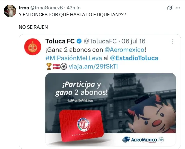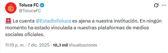 Entre tantos temas que se han suscitado alrededor de la noticia, el Deportivo Toluca ha publicado por medio de X que la cuenta del Estadio Nemesio Diez es ajena a la institución, reiterando que no está vinculada a nada que tenga que ver con el equipo.