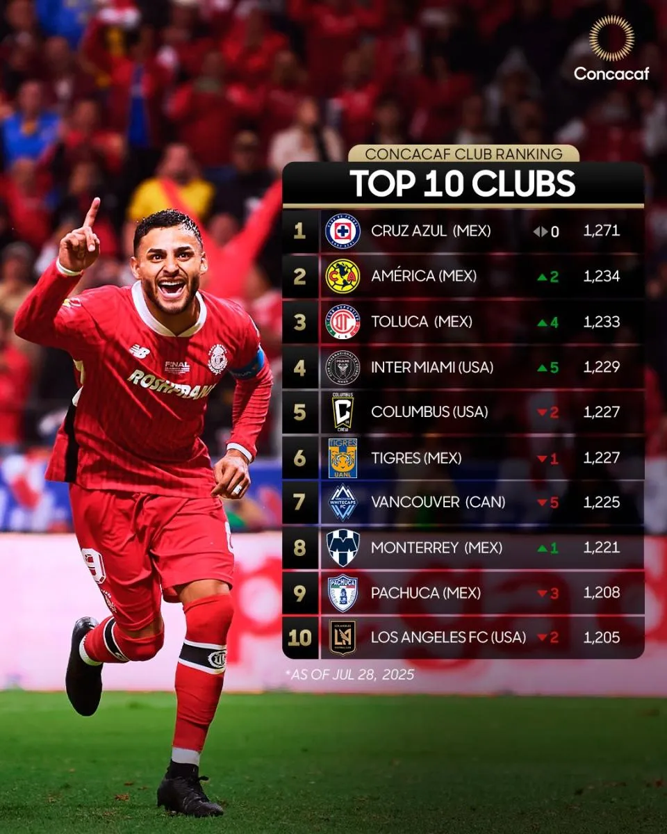 La Concacaf dio a conocer su más reciente Ranking de Clubes, actualizado al 28 de julio de 2025, y las posiciones han sorprendido a más de uno. Cruz Azul se mantiene firme en el primer lugar con 1,271 puntos, consolidándose como el mejor equipo de la región, mientras que América subió dos posiciones para ubicarse en el segundo sitio con 1,234 puntos. Sin embargo, la gran sorpresa la protagonizó el Toluca, que escaló cuatro peldaños y ya se ubica en el tercer puesto tras conquistar el título de la Liga MX.