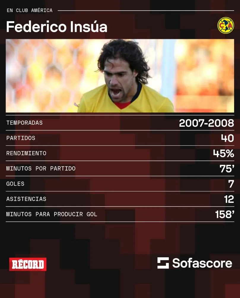 Pero hay un equipo por el cual también pasó Insúa y se trata del acérrimo rival de Chivas, el Club América, donde jugó de 2007 a 2008. El argentino disputó 40 encuentros y anotó en siete ocasiones, también alcanzó 12 asistencias.