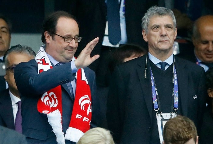 El presidente de Francia, Francois Holland saluda a la gente en el estadio