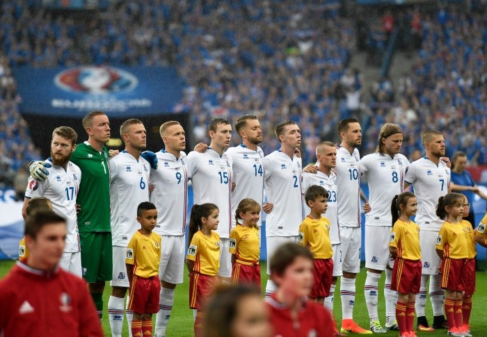Los seleccionados de Islandia al momento de cantar su himno