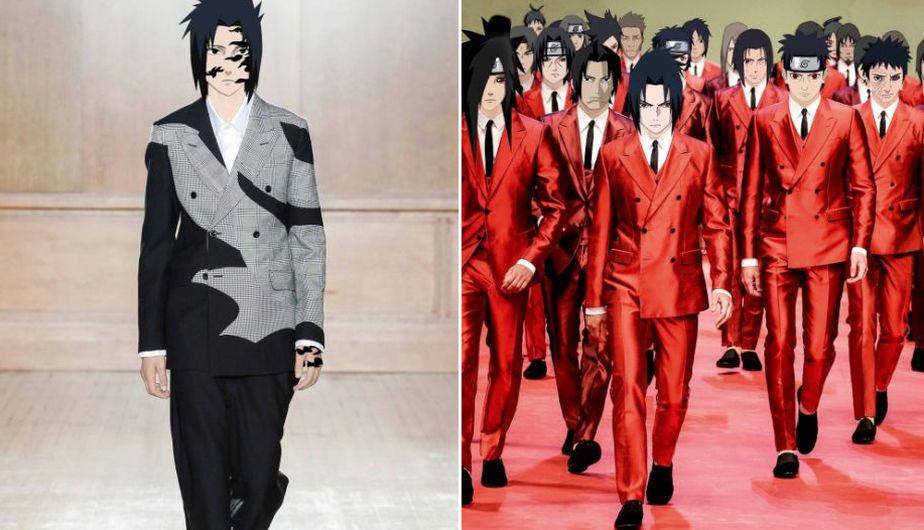 Sasuke de traje negro y gris y el clan Uchiha con atuendo en rojo