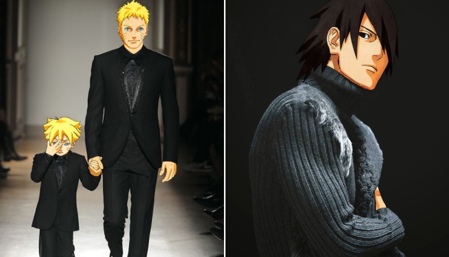 Boruto junto a Naruto, con un elegante traje en negro