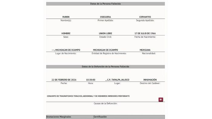 Acta de defunción de “El Mencho” revela cómo murió el líder del Cártel Jalisco Nueva Generación