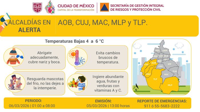 Autoridades de la Ciudad de México activaron la alerta amarilla por bajas temperaturas en varias alcaldías de la capital debido al pronóstico de frío intenso durante la madrugada del viernes 6 de marzo. De acuerdo con los reportes meteorológicos, el descenso en la temperatura podría alcanzar hasta los 4 grados Celsius en algunas zonas.
