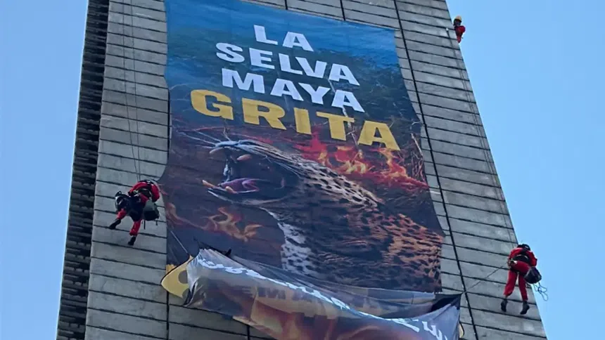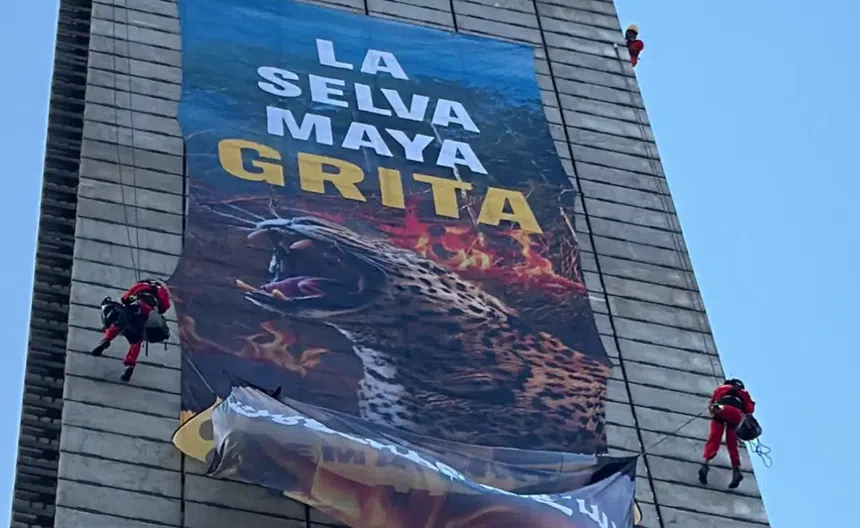 Los activistas, vestidos con atuendos naranjas, iniciaron el ascenso alrededor de las 6:00 horas y lograron alcanzar una altura de 70 metros. Desde esa posición, desplegaron una manta de 27 metros con el mensaje: “La Selva Maya Grita”, acompañada de la imagen de un leopardo, símbolo de la fauna que habita la región. Además, otro grupo de la organización acordonó la base del monumento y mostró carteles con frases que evidencian la destrucción que vive la región.