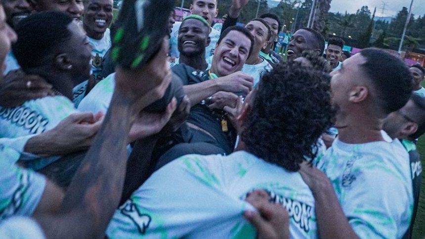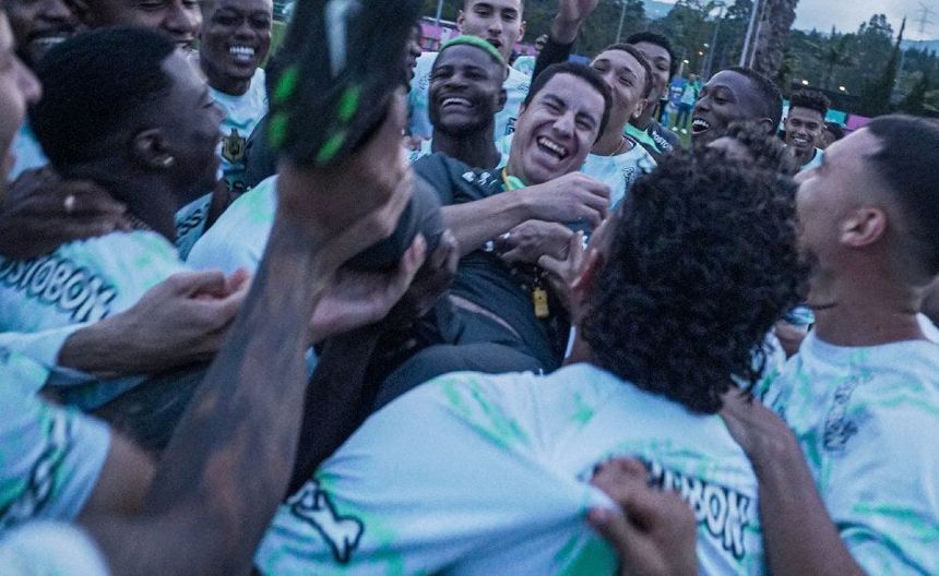 Mientras los aficinados cantaban, todos los jugadores de Atlético Nacional se juntaron y cargaron a Juárez, otra muestra de que el joven entrenador mexicano se ha ganado a todo el vestidor.