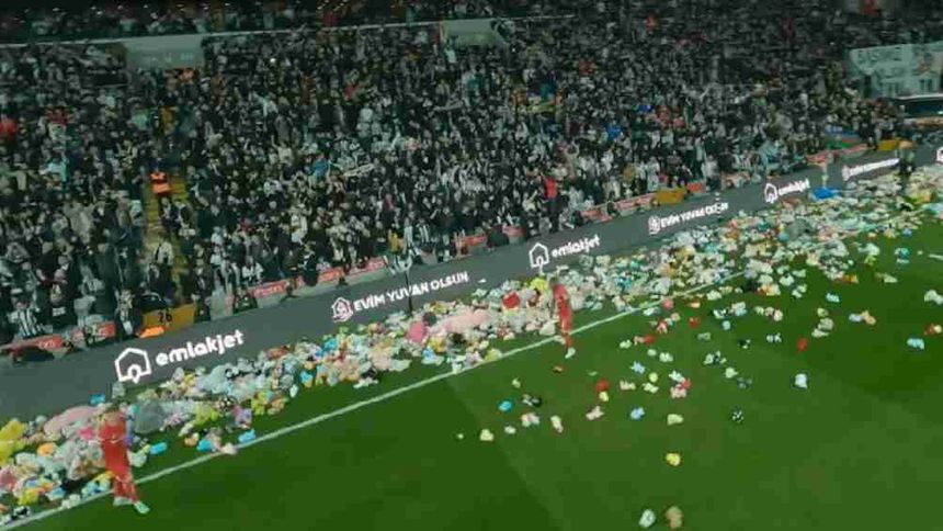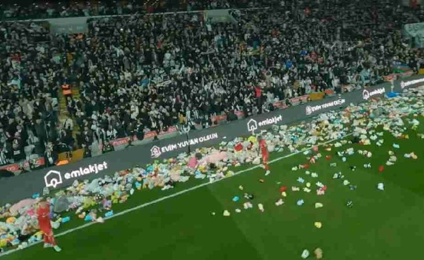 Aficionados de Besiktas arrojan peluches para niños afectados por terremoto en Turquía