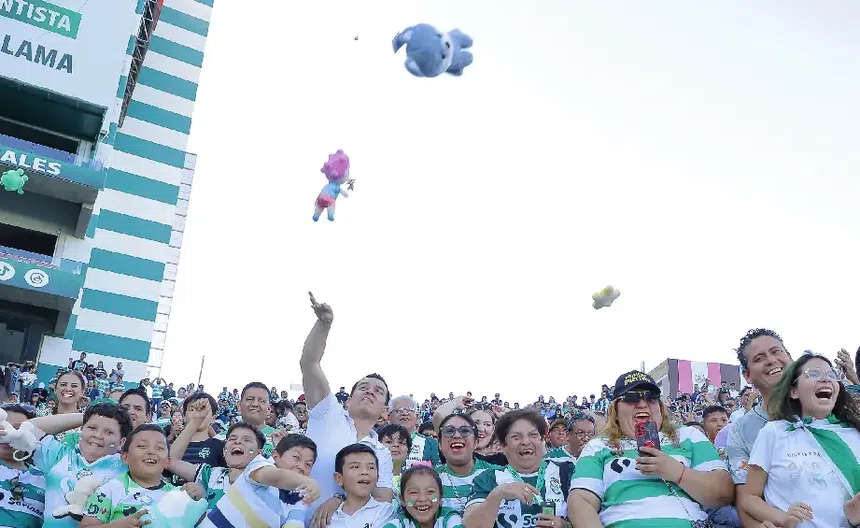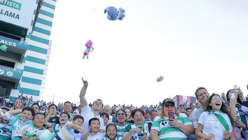 Aficionados de Santos se unen al 'Guerretón 2025' y lanzan peluches al terreno de juego