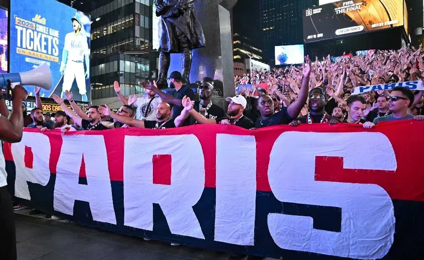 Aficionados del PSG se adueñan de Times Square, en New York, previo a la Final ante el Chelsea