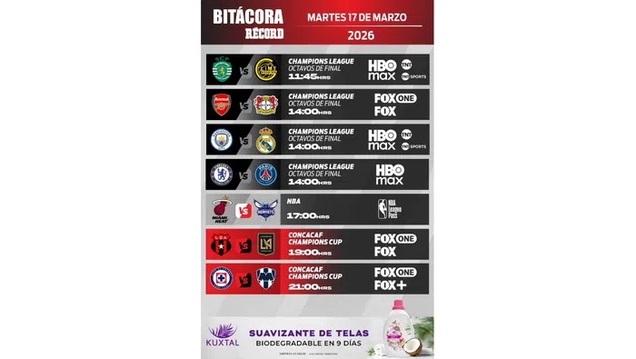 La agenda deportiva de este martes 17 de marzo de 2026 llega cargada de actividad con partidos imperdibles en la Champions League, la Liga de Campeones de la Concacaf y la NBA, en una jornada que RÉCORD te presenta con todos los detalles para no perderte ningún encuentro. La cartelera incluye enfrentamientos de alto nivel con equipos como Real Madrid, Manchester City, Arsenal, PSG y clubes de la Liga MX.