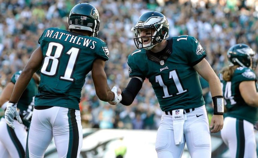 Wentz, novato que fue la segunda selección general del draft, conectó con Darren Sproles en una jugada de 73 yardas que concluyó en la zona de anotación. Lanzó un pase de 12 yardas a Jordan Matthews, para otro touchdown.