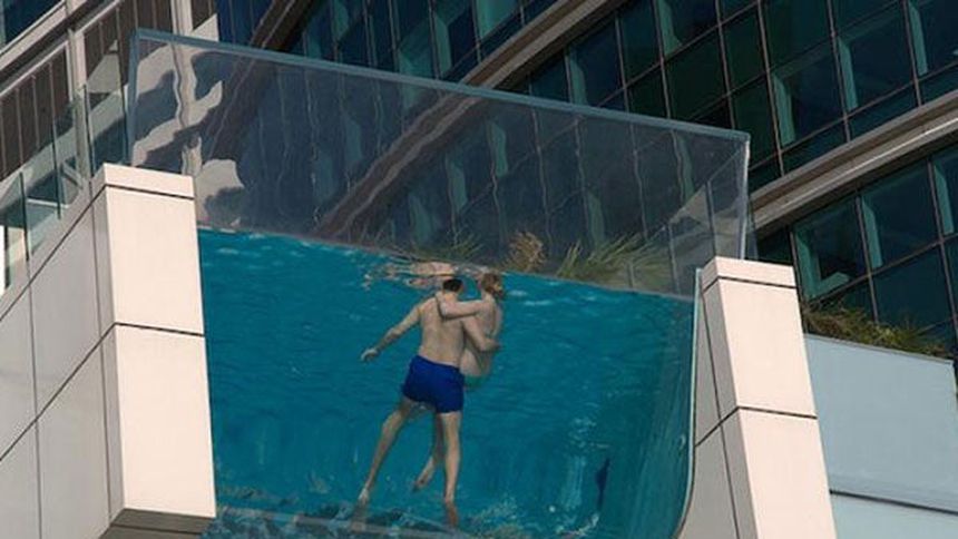 Esta alberca fue construida con un fondo de cristal y está ubicada en el piso 24 del hotel Holiday Inn de Shangai, en China. Fue diseñada por Chan Sau Yan, y es la primera alberca de este tipo en ese país.