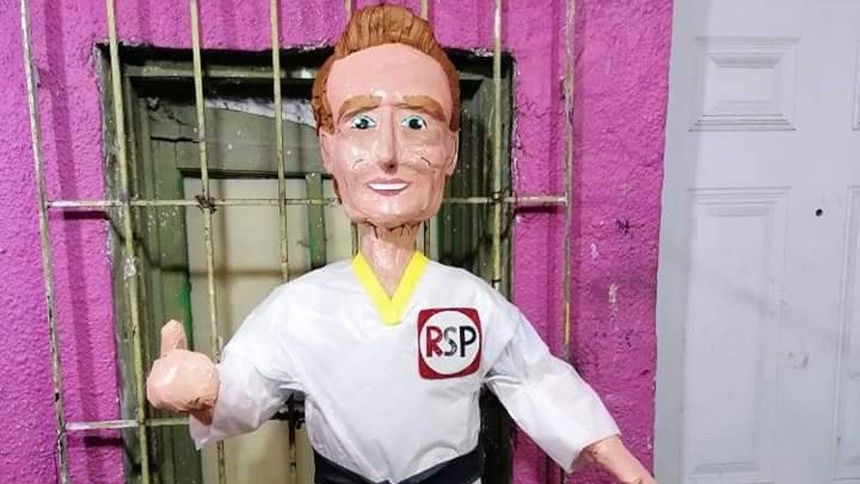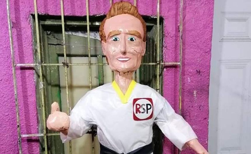 La piñata del actor, conductor y candidato del partido Redes Sociales Progresistas, viste un 'Karate-gi', el uniforme que utilizan los karatecas, con la famosa "cinta negra" y el logotipo de la facción.