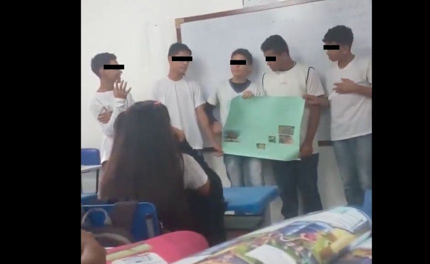 El hecho ocurrió en un salón de clases donde un grupo de jóvenes presentaba un tema con una cartulina como material de apoyo. Según el video, la exposición era por turnos y mientras uno de ellos hablaba, la niña que estaba sentada en los puestos de enfrente hizo algunos gestos que parecían burlarse de su compañero.