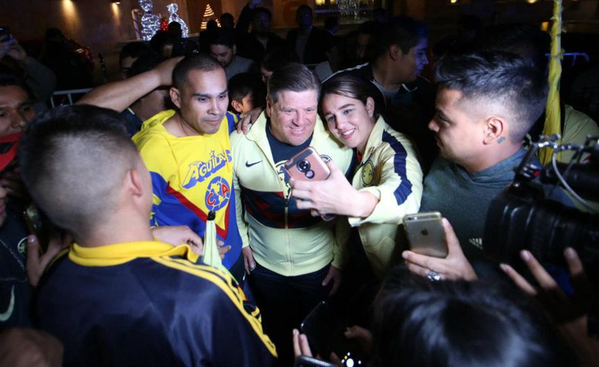 Miguel Herrera agradeció las muestras de cariño de la afición del América. El entrenador azulcrema saludó a los aficionados que acudieron al hotel donde se hospedaron las Águilas, provocando la euforia de los asistentes.