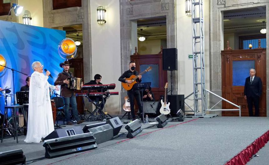 El escenario del Salón de Tesorería del Palacio Nacional, donde el presidente ofrece cada día sus llamadas “mañaneras”, amaneció cubierto de un gigantesco telón blanco, detrás del cual esperaba la cantante Eugenia León para ofrecer un recital.
