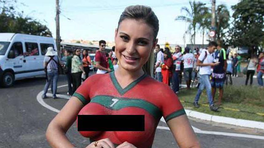 Andressa, que actualmente es una de las presentadoras del programa 'Muito Show', dejó al descubierto sus senos, a pesar de haberse cubierto con pintura, simulando la playera de Portugal.