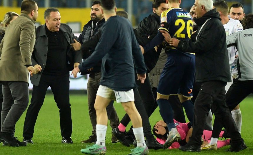 El árbitro, que cayó al piso, fue pateado también en el tumulto que se produjo cuando los aficionados invadieron el terreno de juego tras el gol del empate del Rizespor en el último minuto.