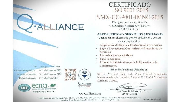 Aeropuertos y Servicios Auxiliares (ASA) informó que mantiene vigentes sus certificaciones internacionales ISO, tras superar las auditorías de vigilancia más recientes realizadas por organismos certificadores independientes en 2025.