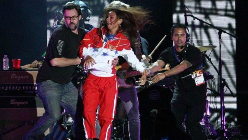Al llegar al escenario, la deportista fue capturada y desalojada por elementos de seguridad antes de llegar con el famoso artista cafetalero.