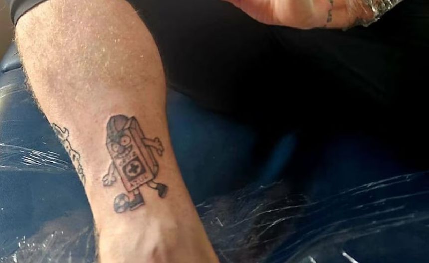 El tatuaje, que ahora porta a la altura de su tobillo, tiene a un también conocido como ‘Costalito’ más caricaturesco. Además, se pudo observar al bajista en las inmediaciones del estadio con su playera del equipo celeste y una máscara con los colores del equipo de La Noria.