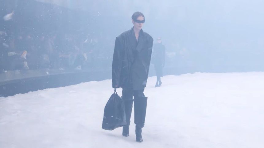 El desfile de Balenciaga protestó contra el conflicto armado de Rusia sobre Ucrania y la emergencia climática global por lo que los modelos desfilaron con las bolsas de basura bajo una tormenta de nieve simulada.