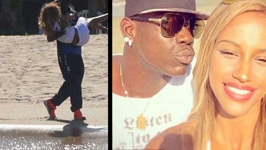 El futbolista italiano Mario Balotelli fue captado cargando a su novia Fanny Neguesha por las playas de Brasil mientras celebran que están comprometidos.