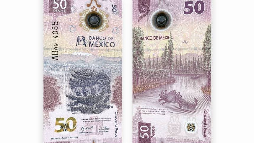 En la parte superior del billete, se ubica la tradicional ventana transparente que cambia de color y cuenta con una textura de cinco puntos, formando un medio círculo, mientras que, en el reverso destaca la imagen de un ajolote junto a los lagos de Xochimilco.