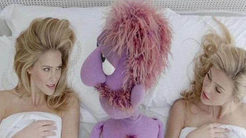 En el comercial de la marca de ropa Hoddies, la espectacular rubia, de 28 años, aparece junto a dos clones cumpliendo las fantasías de una marioneta llamado Red Orbach, miembro del grupo de rock ficticio Red Band.