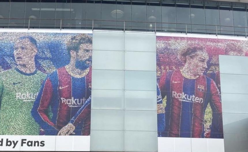 El primer fue el anuncio de Rakuten que se ubica en la fachada del estadio y que contaba con las imágenes de Messi, Marc-André ter Stegen, Gerard Piqué, Antoine Griezmann y Frenkie de Jong.