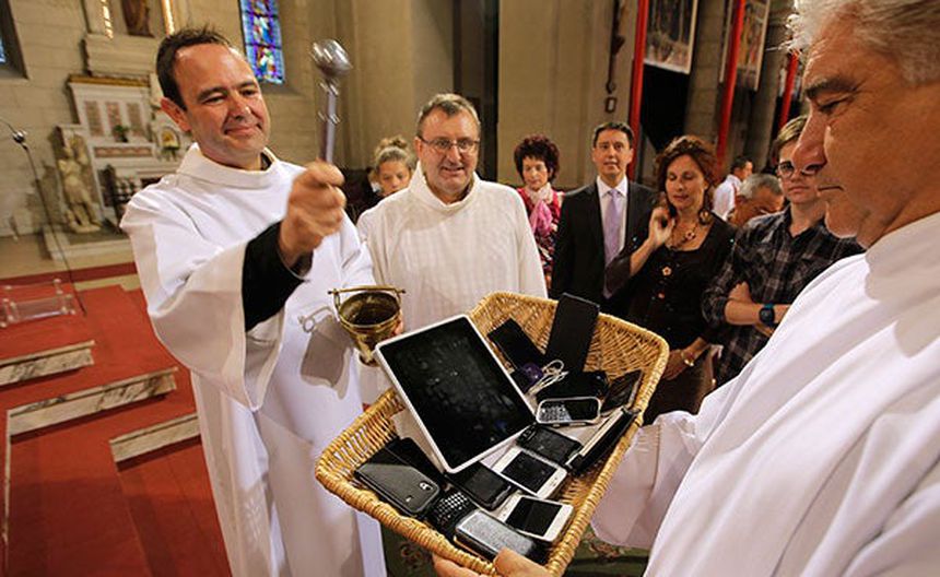 El párroco francés Yves Marie Lequin bendijo teléfonos, computadoras y dispositivos electrónicos destinados a la comunicación entre los seres humanos durante la misa que celebró en la parroquia de San Pierre D’Arene, ubicada en Niza, al sur de Francia.