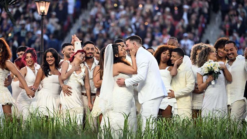 El momento de la boda coincidió con la aparición especial de Lady Gaga, quien interpretó una versión adaptada de uno de sus temas mientras la pareja permanecía en el escenario. Tras el intercambio del “sí, quiero” y el beso de los recién casados, el espectáculo continuó con normalidad, integrando la ceremonia al mensaje general del show.