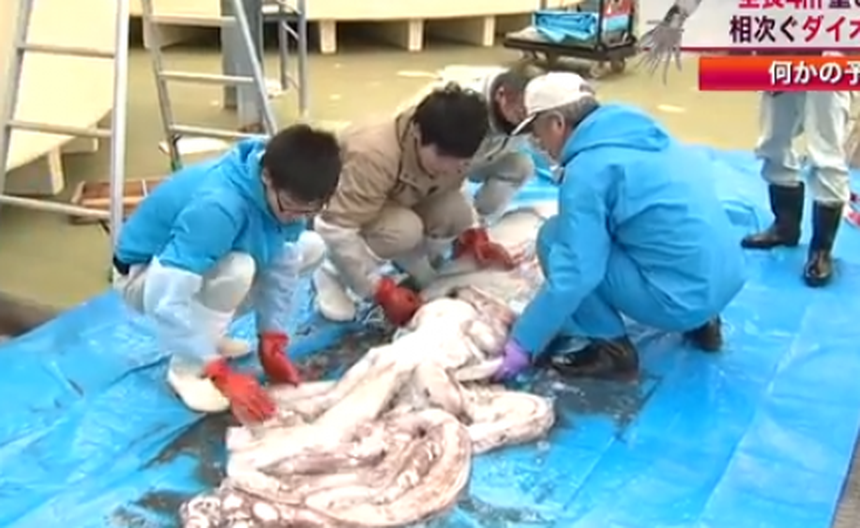 Pescadores en la isla de Sadogashima capturaron un enorme calamar, según un video difundido por la cadena de televisión Grind TV, el 'monstruo marino' midió 4 metros de largo y pesó 160 kilogramos.
