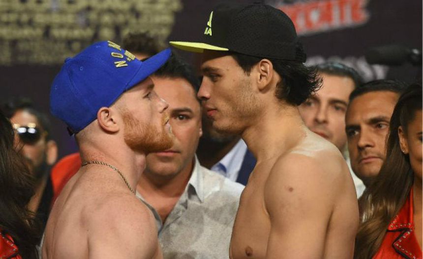 Álvarez y Chávez Jr se encaran en una ceremonia de pesaje en 2017 | MEXSPORT