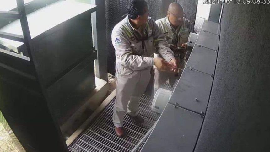 En el video se observa como los trabajadores revisan los medidores, mientras su compañero abre el centro de carga y empieza presuntamente a robar dos equipo térmicos de uno de los locales que está por abrir.