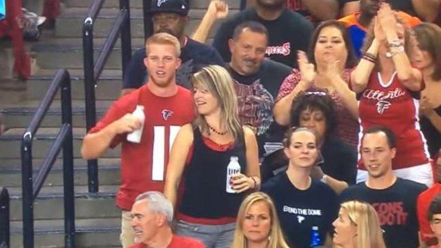 En la Semana 3 de la NFL, durante el partido entre Bucaneros de Tampa Bay y los Halcones de Atlanta, una aficionada se emocionó cuando los Halcones anotaron un Touchdown y lo celebró de una manera un tanto peculiar ya que acarició a su acompañante en 'zona prohibida' y fue captada por la cámara de televisión.