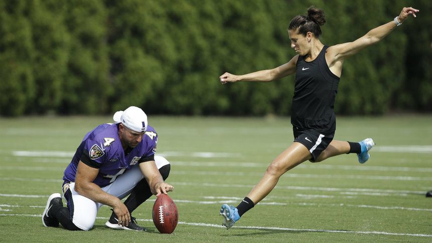 La futbolista estadounidense probó en el futbol americano y dejó sorprendidos a los jugadores de Eagles y Ravens