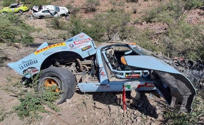 Durante uno de los recorridos de velocidad en la etapa Durango-Parras, tres automóviles, dos de ellos de competencia y una patrulla de la Guardia Nacional derraparon, perdieron el control y cayeron a un pequeño barranco.