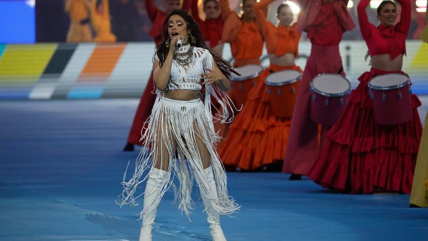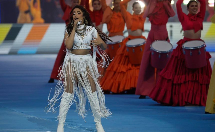 Cabello, que tendría que haber salido a cantar a menos de 10 minutos del pitido inicial, no comenzó su espectáculo hasta pasadas las 21:20 hora local. La nacida en Cuba, acompañada por un centenar de bailarinas que se desplazaron por un tapete azul desplegado en el césped, destacó con la interpretación de "Señorita", uno de sus primeros grandes éxitos.