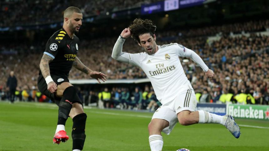 Jugadores del Manchester City y el Real Madrid disputan un balón | AP