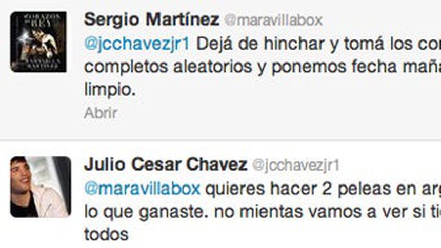 La rivalidad entre Julio César Chávez Jr. y Sergio ';Maravilla'; Martínez continua afuera del ring. Después de que el mexicano subiera en su cuenta de Twitter imágenes donde se mostraba parte de su entrenamiento el argentino le recomendaba tomar los controles antidoping completos.
