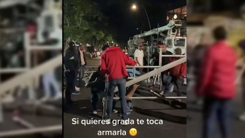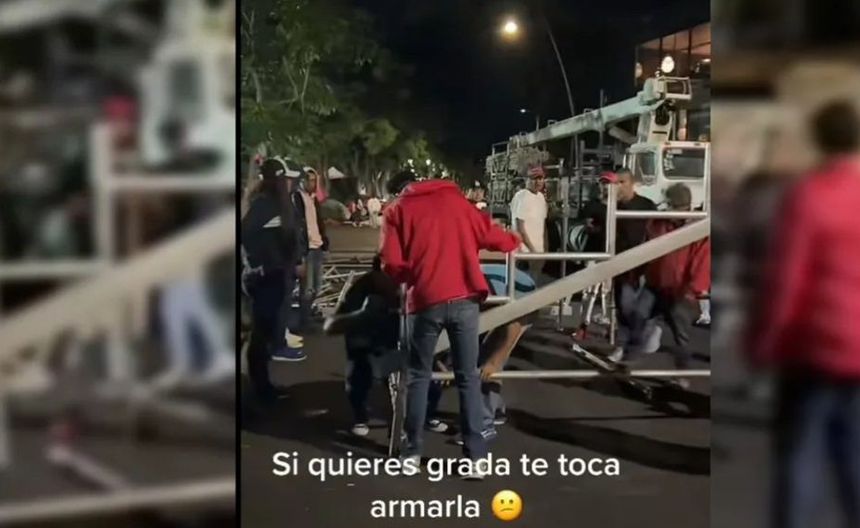 A través de redes sociales se dieron a conocer imágenes de que los asistentes que decidieron madrugar para ver el evento tuvieron que armar las gradas para tener un lugar donde sentarse, pues aún no estaban montadas.
