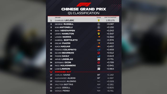 En su último intento, Antonelli marcó un tiempo de 1:32.064, superando a Russell por 0.222 segundos. Russell, quien había ganado la carrera Sprint del sábado, solo pudo completar una vuelta rápida en la fase final de la clasificación tras sufrir un problema que detuvo brevemente su monoplaza en la pista.