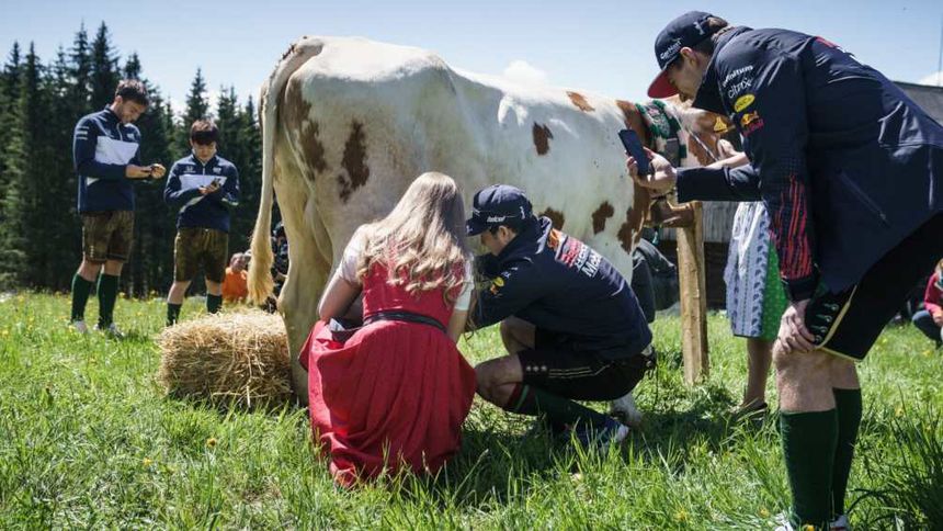 Previo al Gran Premio de Austria, Red Bull y Alpha Tauri realizaron actividades y competencias, en donde inclusive se le vio a Checo Pérez ordeñando una vaca.