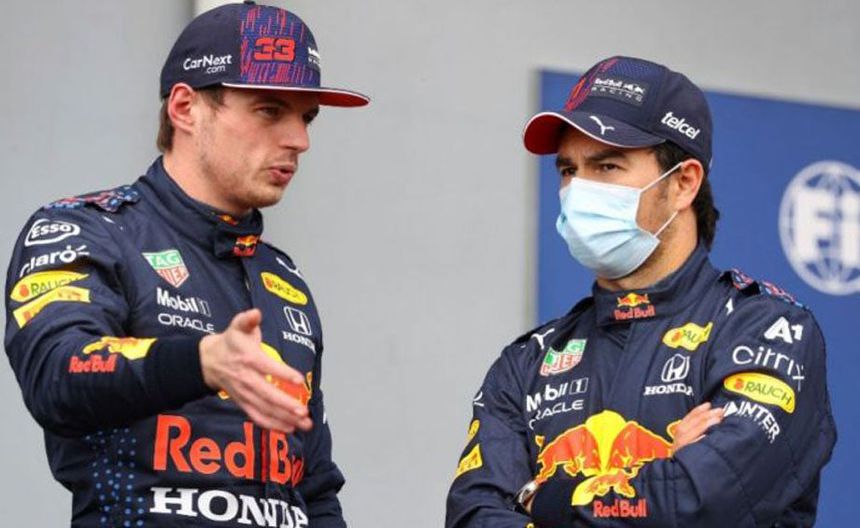 Verstappen y Checo dialogando después de una carrera clasificatoria | AP