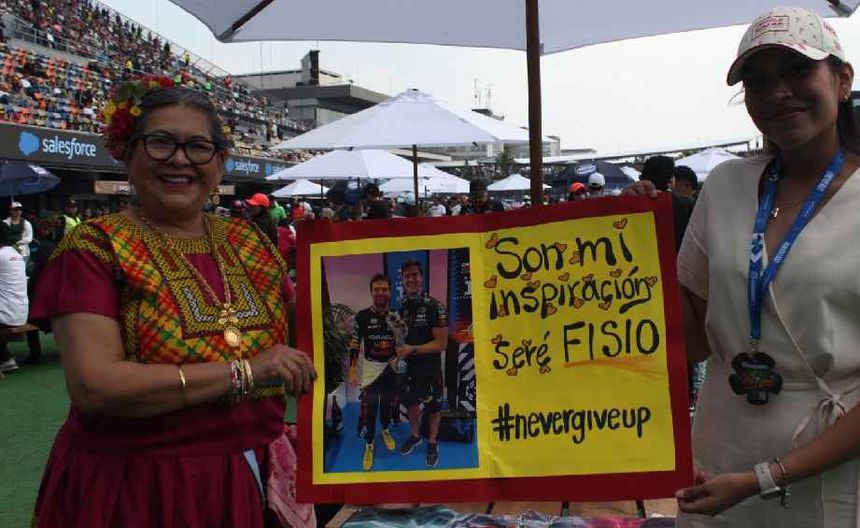 Y entre tantas muestras de cariño para Checo Pérez, un mensaje especial se distinguió del resto. "Son mi inspiración. Seré fisio", se lee en un letrero con una foto del tapatío a lado de su amigo y preparador físico, Jo Canales, así como el inconfundible lema del tapatío "Never Give up".
