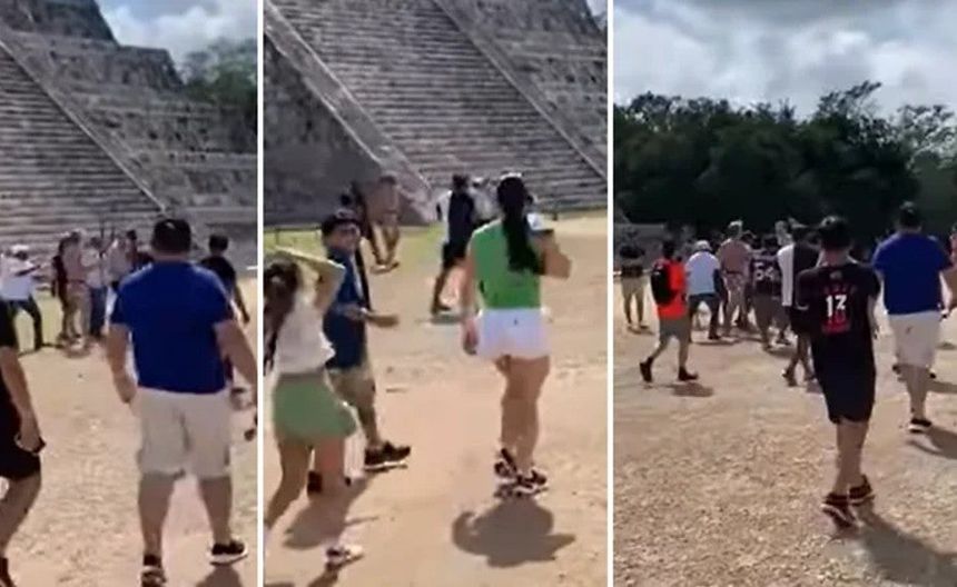 Esto provocó que inmediatamente trabajadores del lugar fueran por él para bajarlo de las escalinatas, pero no quedó ahí, pues otro turista le alcanzó a dar un palazo en un momento que quedó grabado en un vídeo que se hizo viral en redes sociales.