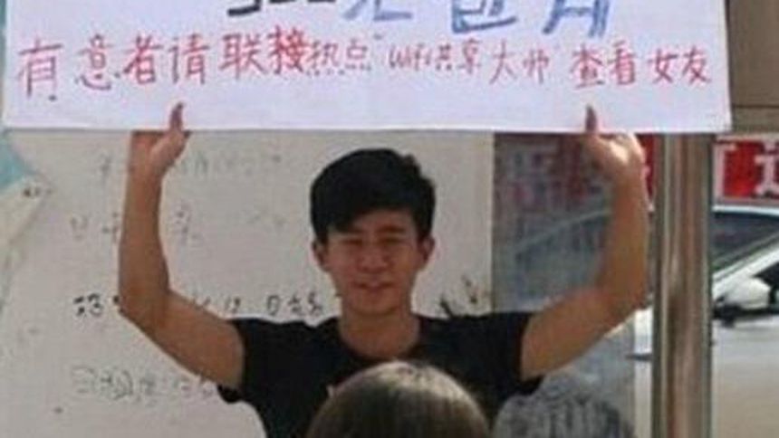 Wei Chu se paró en la entrada de la Universidad de Songjiang con un cartel en la mano que decía "comparto a mi novia", con la intención de recaudar dinero para poder comprar el nuevo teléfono de Apple.